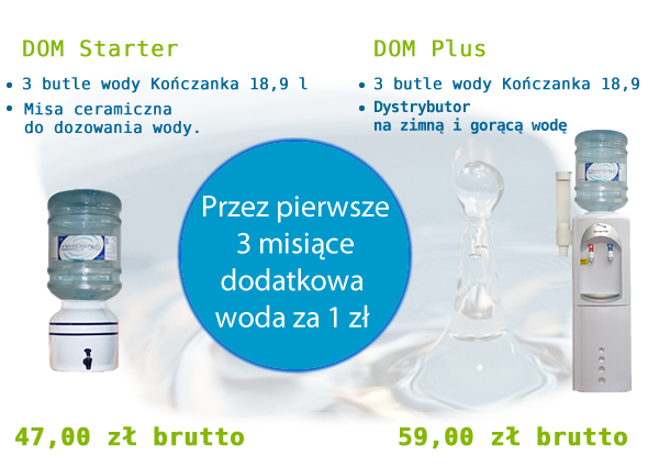 Uwaga! Promocja: przy wyborze pakietu Dom Starter lub Dom Plus przez pierwsze 3 miesiące otrzymujesz dodatkowa butlę wody za 1 zł brutto.
